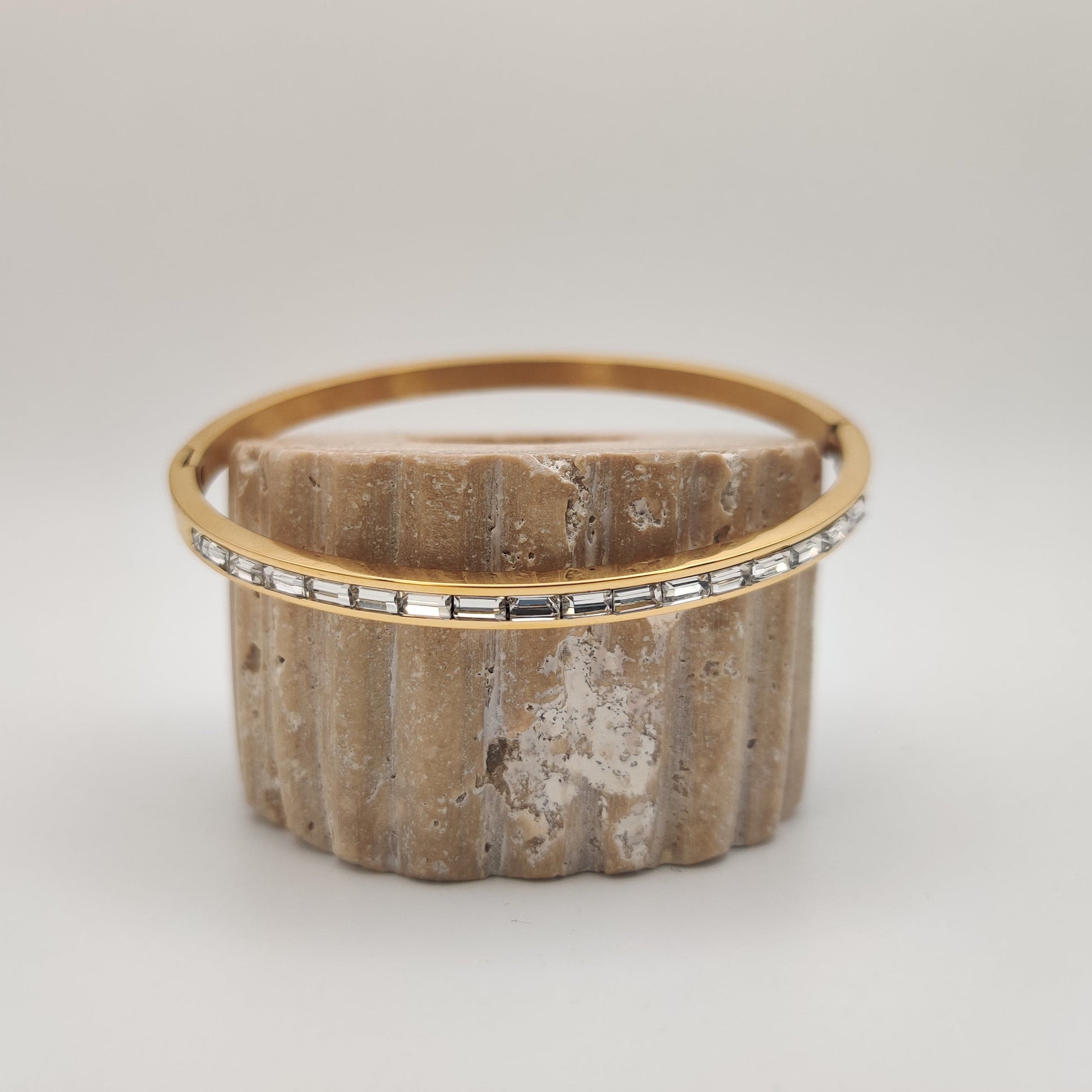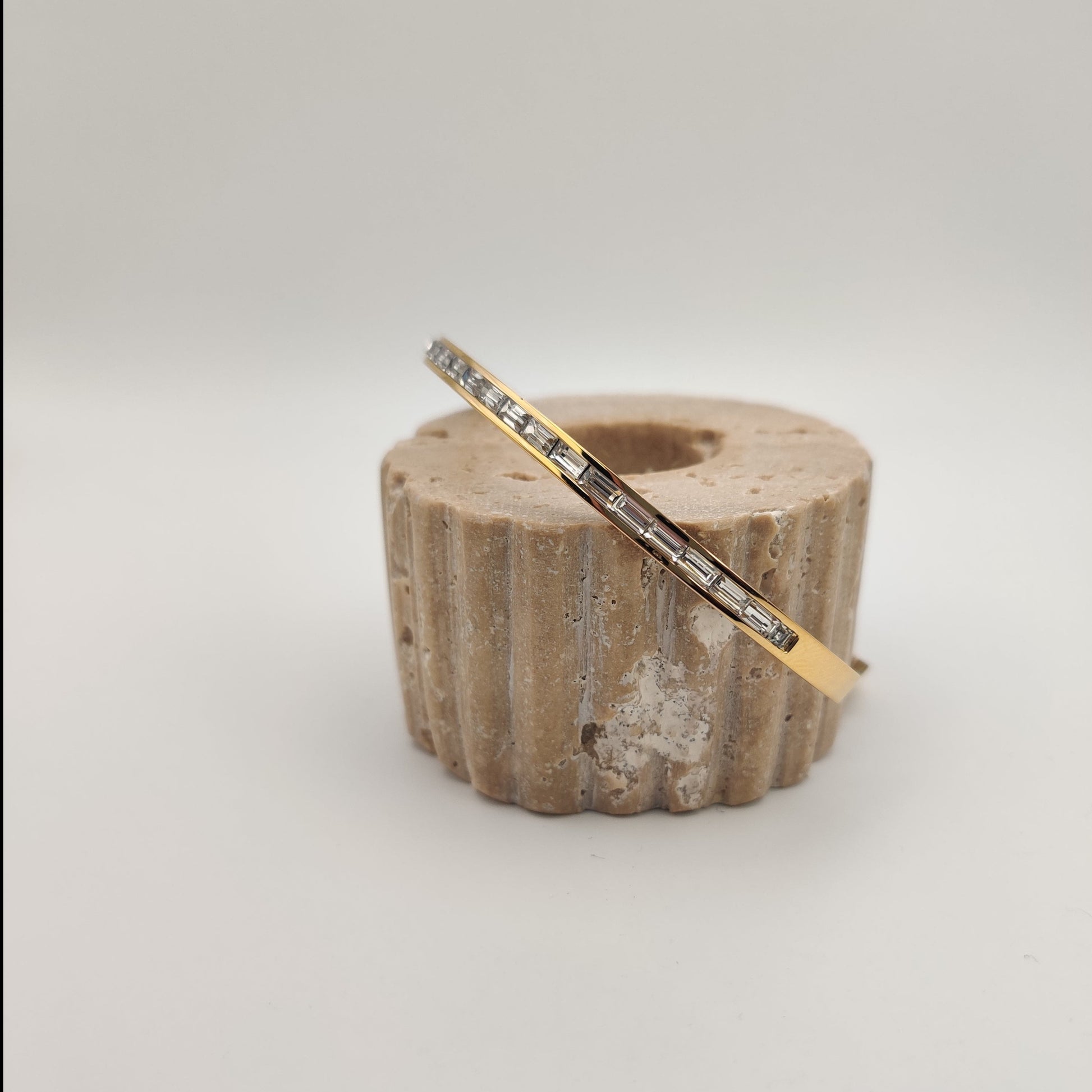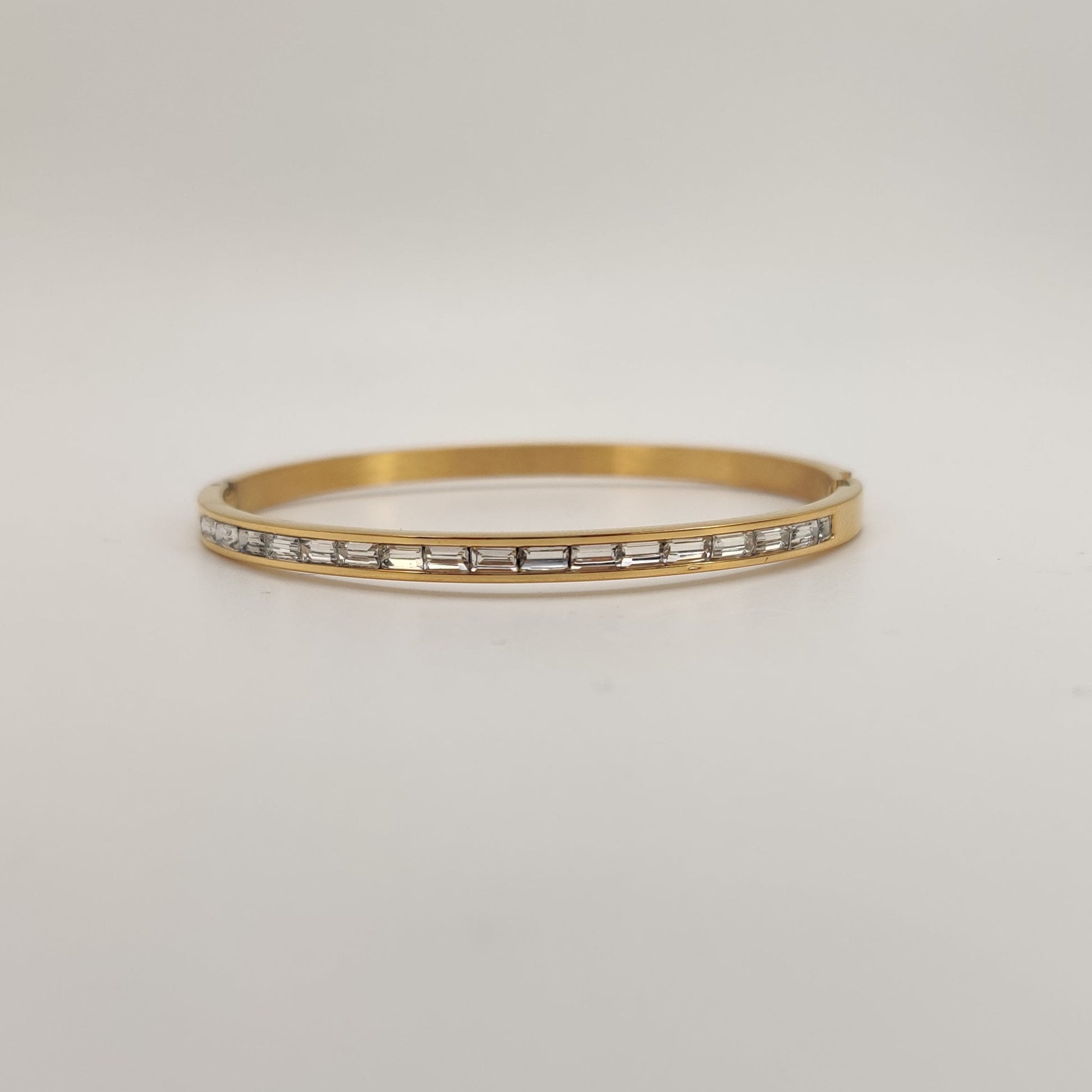 On of our favourites! The sleek oval design of this bangle gracefully contours the wrist, offering a comfortable and flattering fit. Each baguette's elongated form, the clean lines and geometric precision of this design make it a versatile accessory.
