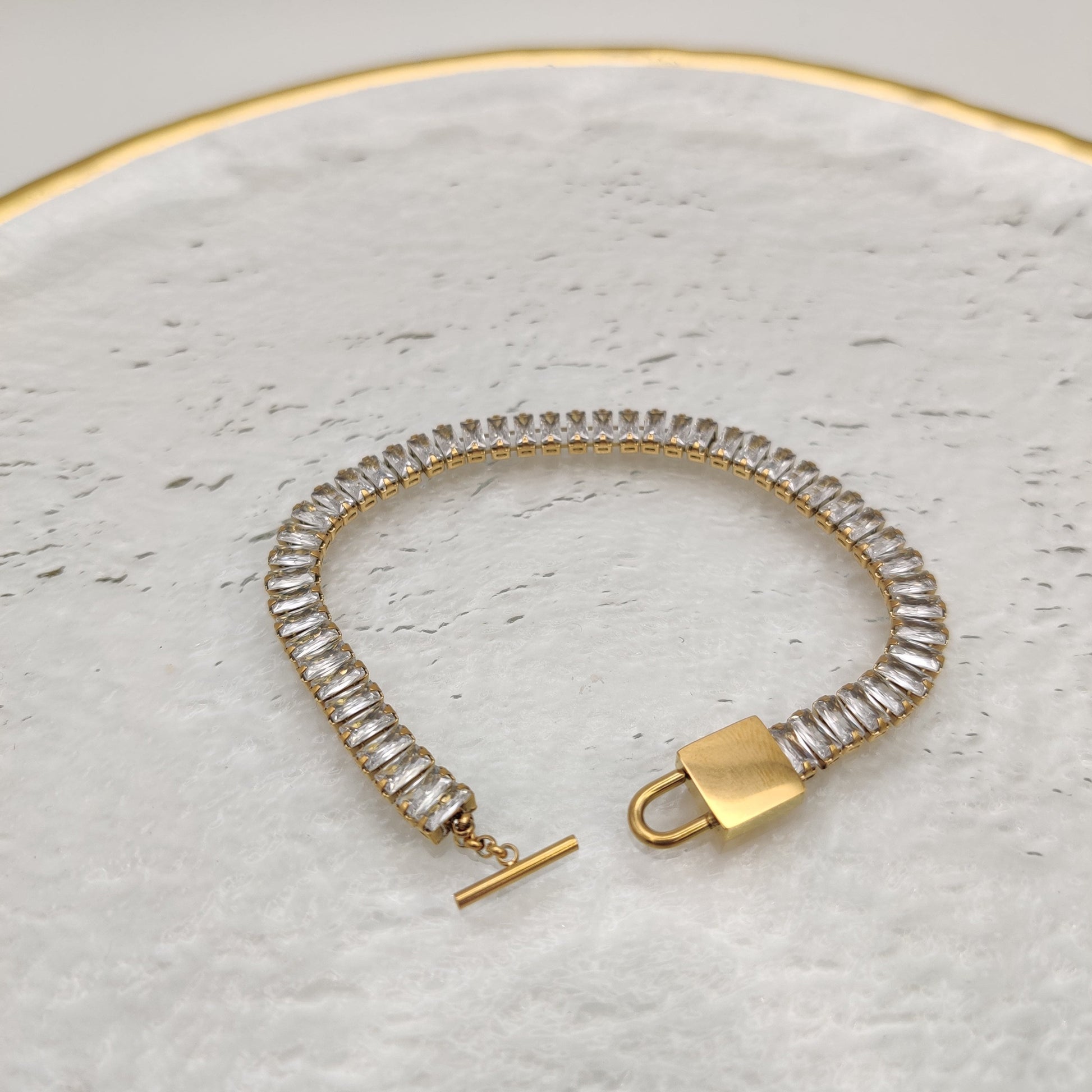 The focal point of this exquisite piece is the dazzling row of baguette-cut CZ stones meticulously arranged to create a stunning visual impact. Each stone with its sleek and elongated form, adds a touch of refinement and glamour. A unique twist to the design is the lock-shaped toggle fastener- a secure but distinctive feature that elevates the bracelet's aesthetic.
