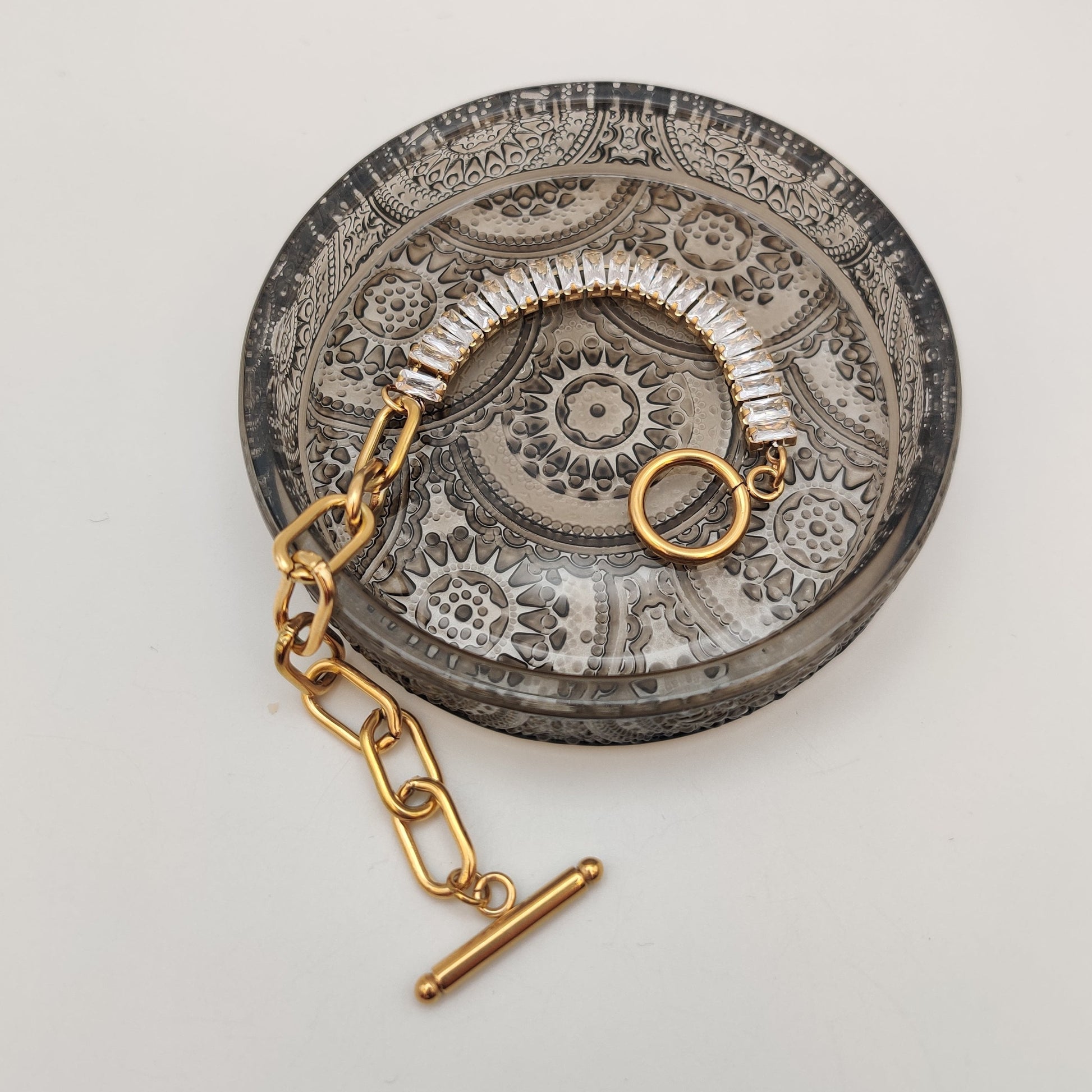 A harmonious fusion of opulence and sophistication! The CZ stones in this bracelet are complemented with meticulously crafted gold link chain that adds a classic touch. The toggle fastener not only secures the bracelet but also serves as a stylish focal point.