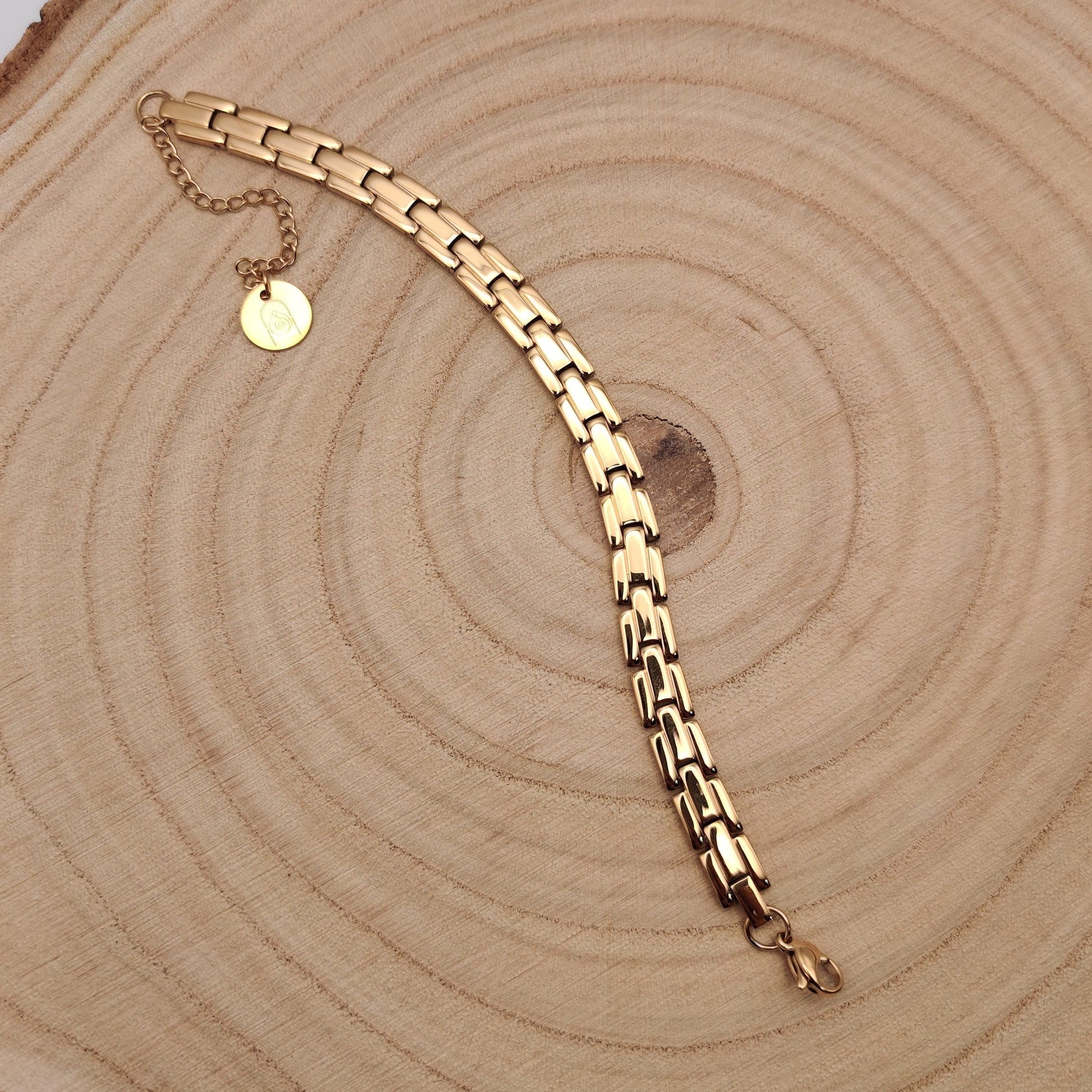 The robust construction in this three link watch strap bracelet is a true embodiment of luxury and function. Perfect for layering with other pieces or stunning on its own!