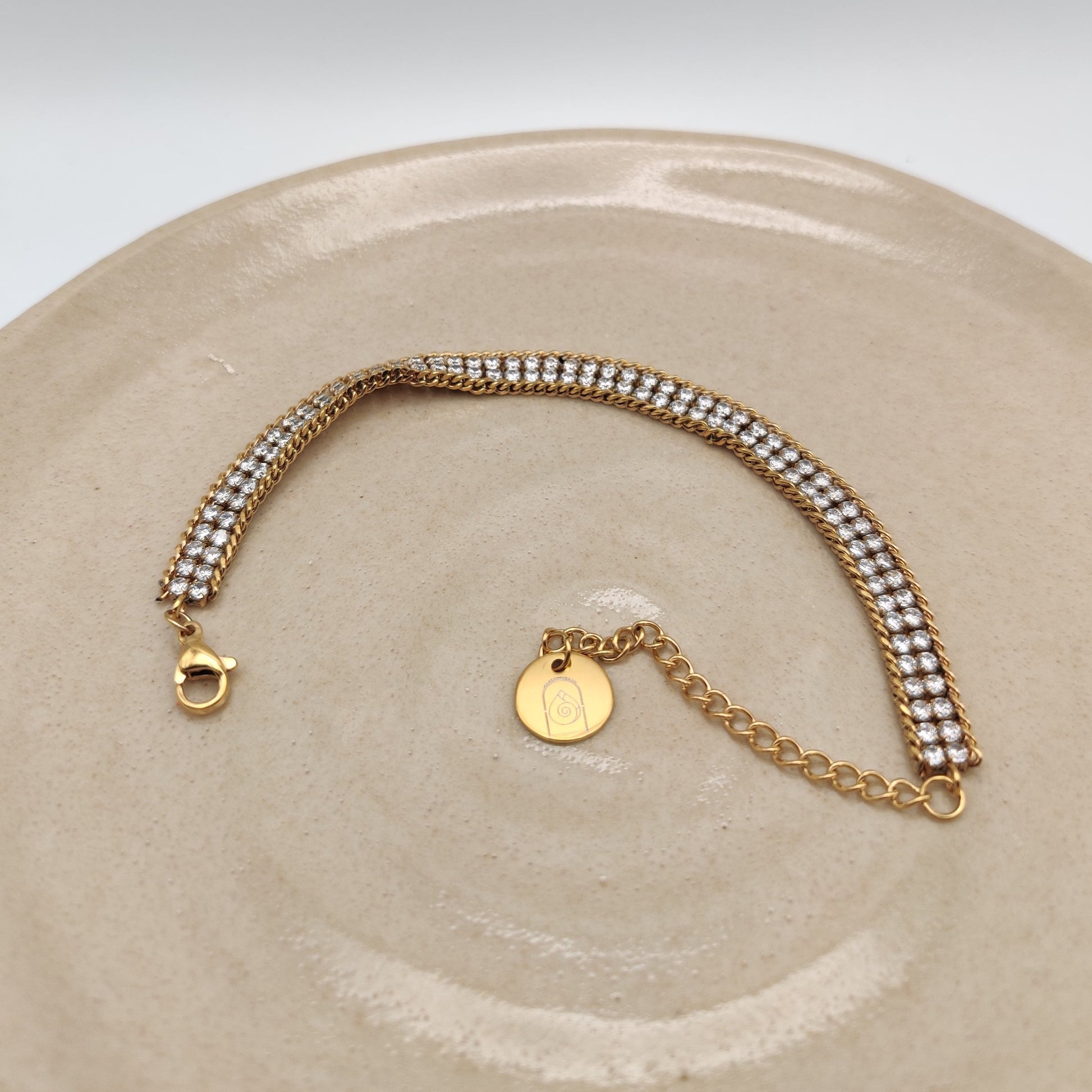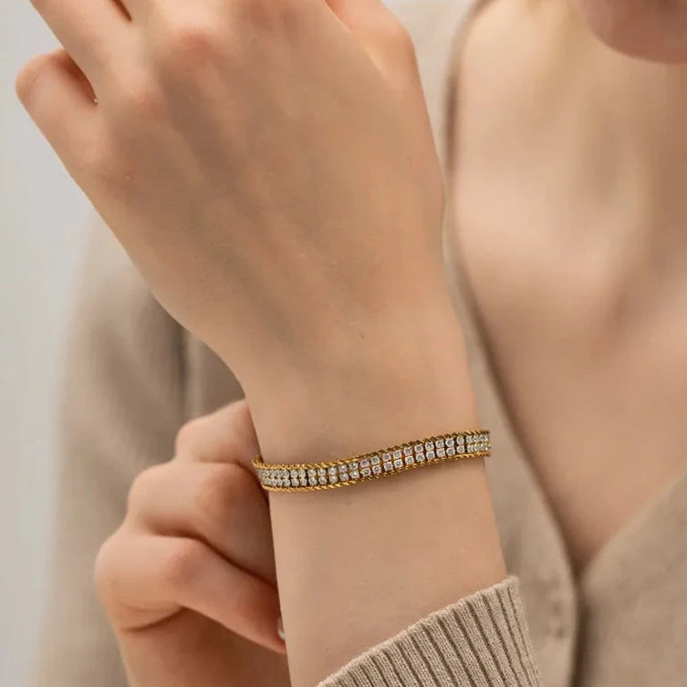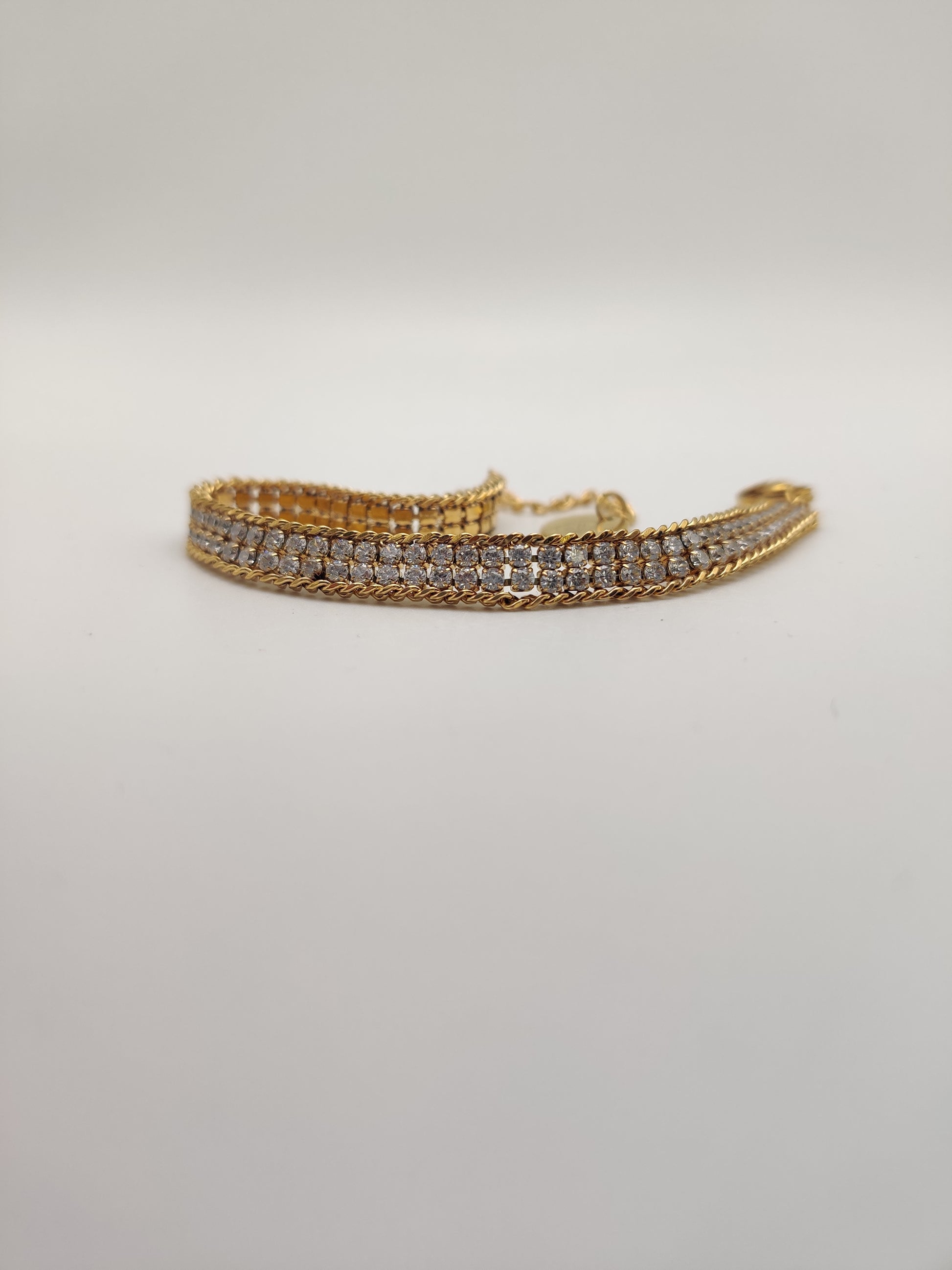Elevate your wrist game with our TwinStrand Tennis bracelet. Uniquely stacked with dual layer of tennis chain with a gleaming gold strands—a perfect fusion of tradition and contemporary fashion.
