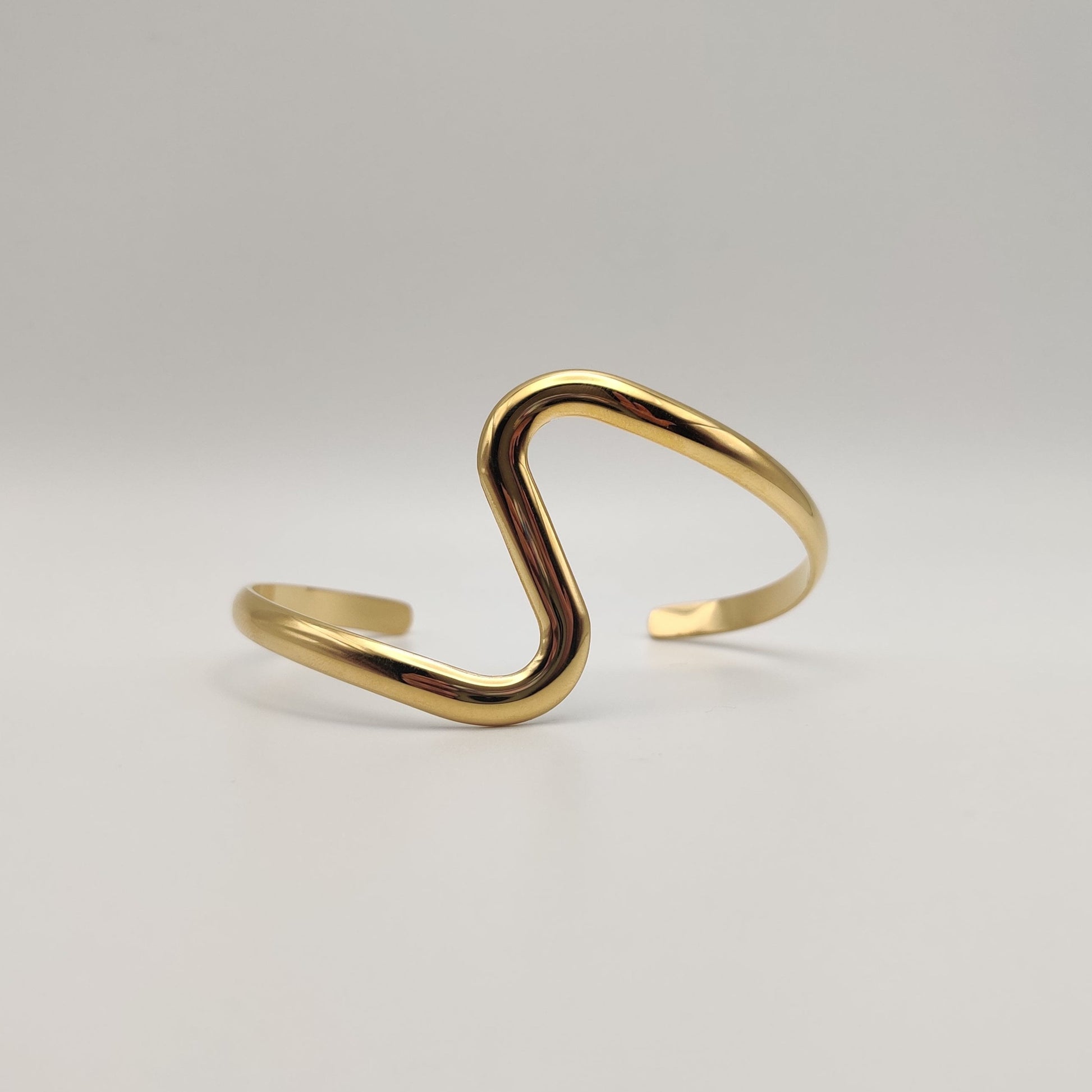 The fluid lines and gentle curves create a visually captivating pattern, evoking a sense of movement and modernity. The open design not only adds a touch of airiness to the bangle but also allows for a comfortable and adjustable fit, conforming to the unique contours of your wrist.